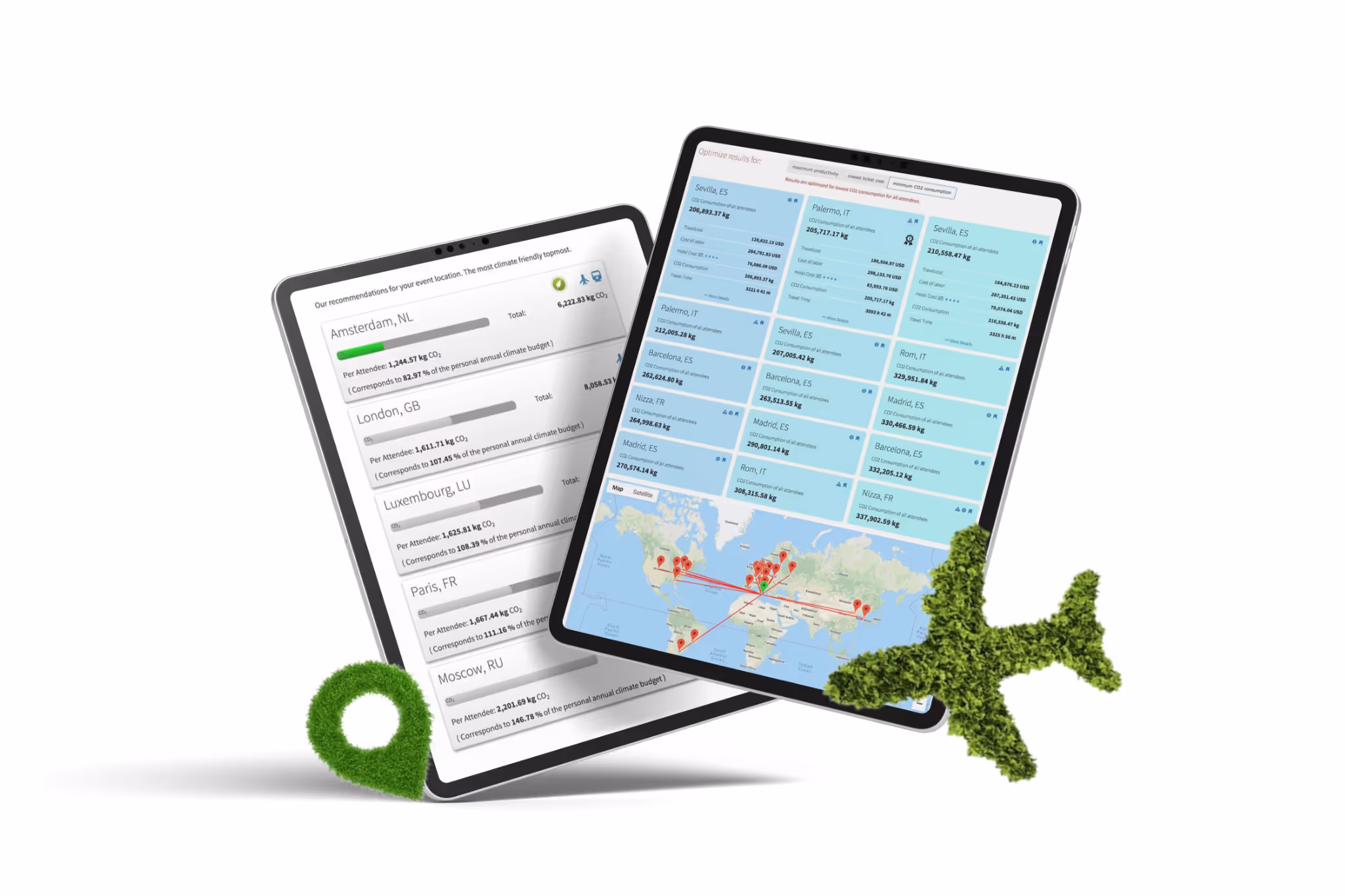 After potential dates and times are entered, the platform calculates and delivers optimal meeting locations based on CO₂ emissions, travel costs, and productivity